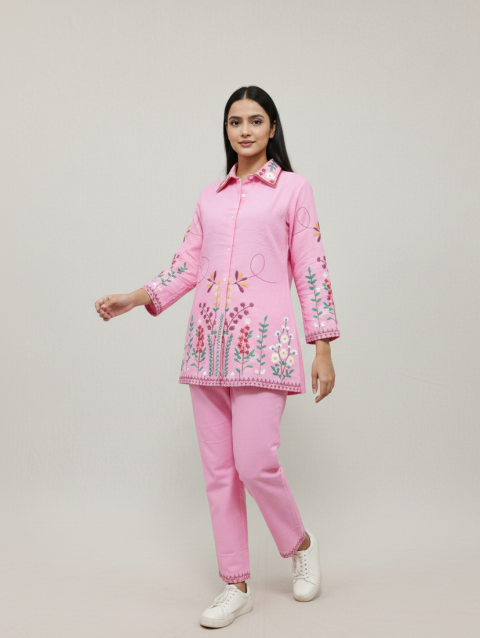 Rose Pink Multicolor Floral Embroidery Co-ord Set