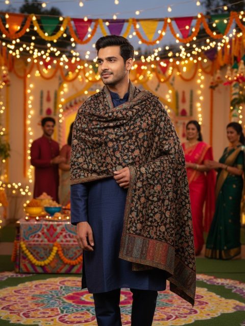 Men’s Black and Golden Pashmina Shawl (Lohi)
