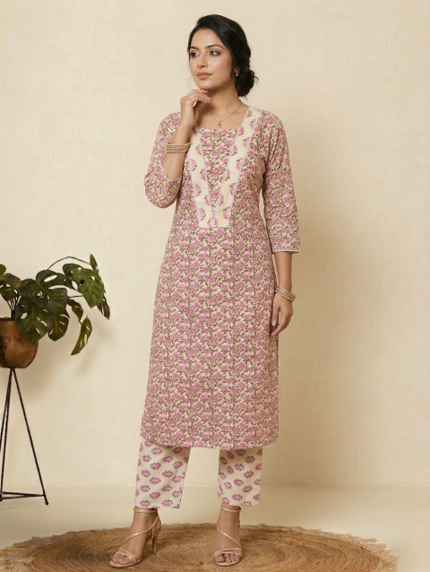 Rose Pink, Sage Green and White Pure Cotton Kurta Set