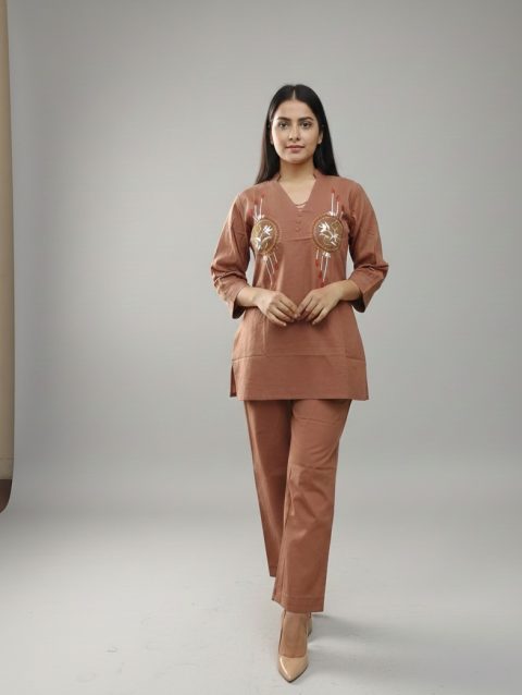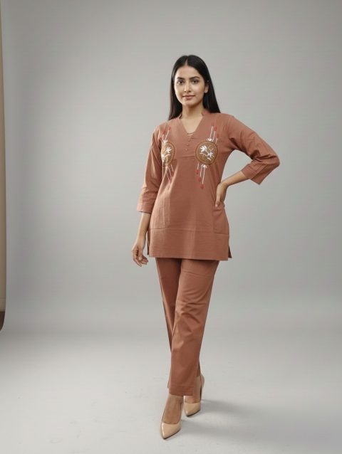 Muted Brown Co-ord Set with Floral Embroidery