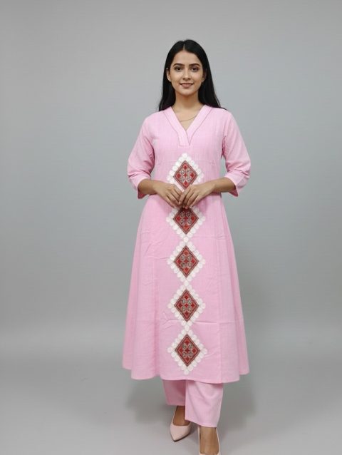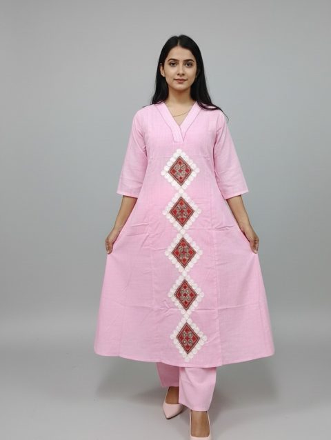 Pure Cotton Geometric Pattern Embroidery Pink Kurta Set