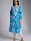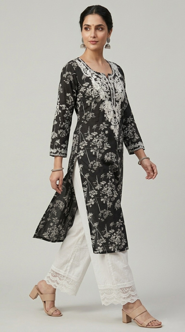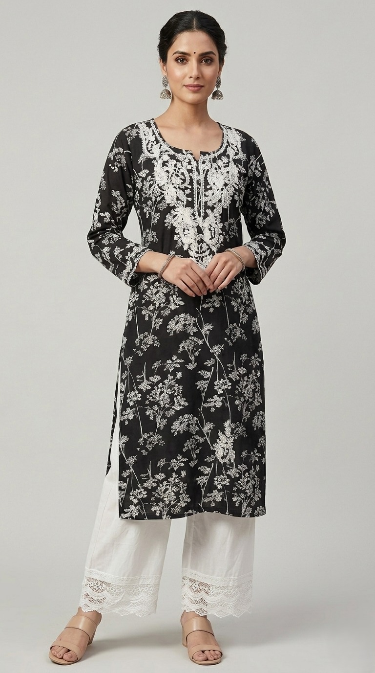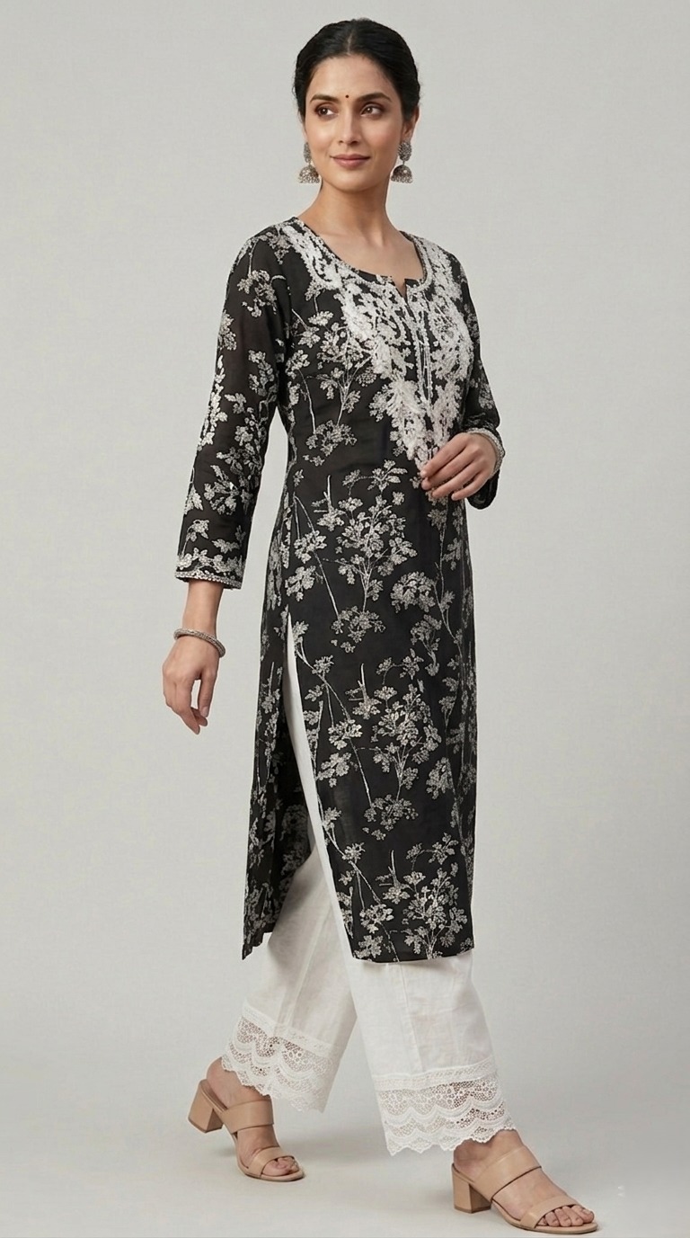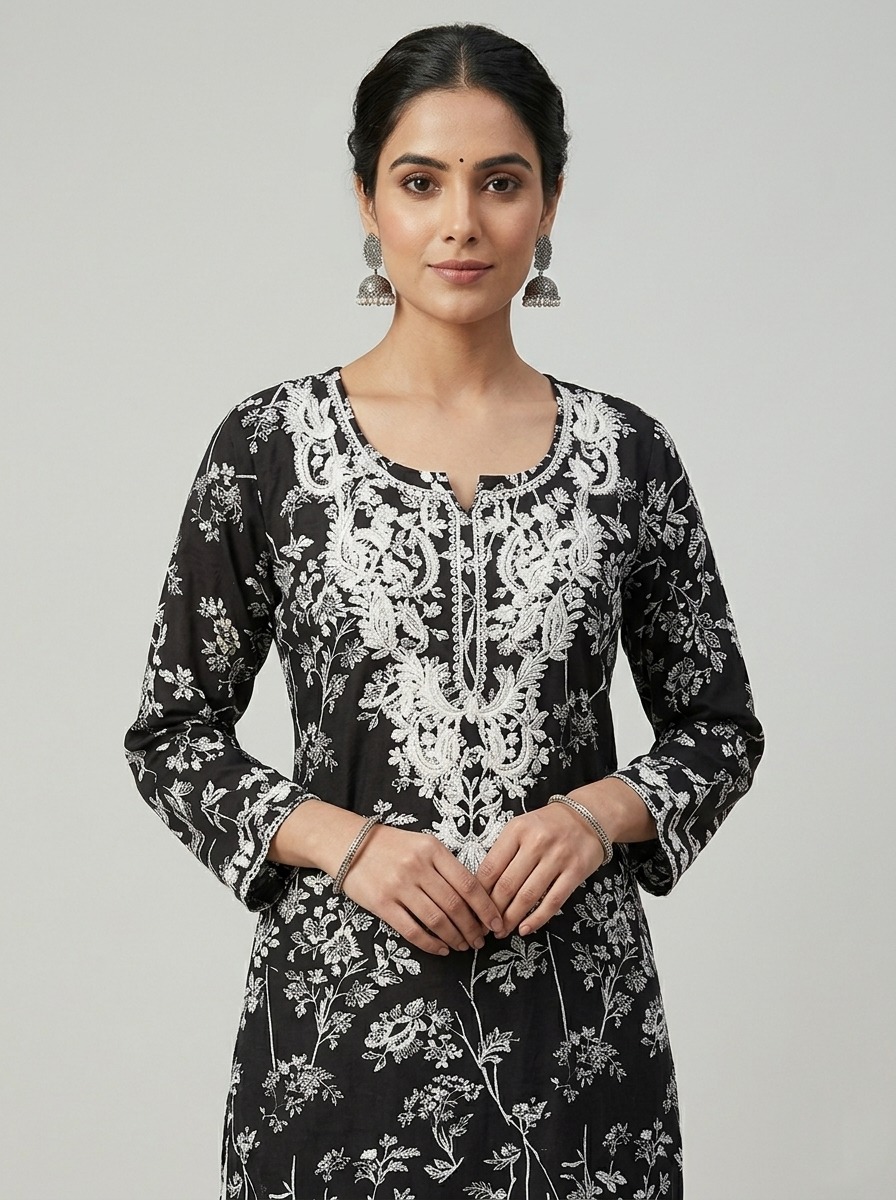 Best Kurta sets in Chandigarh, India by ADD Embrace effortless elegance with this Pure Cotton Black long kurta, beautifully adorned with intricate white floral Chikankari embroidery on neck and Front panel of the kurta. The silhouette features a classic round neckline with a 3/4 sleeves, offering a refined yet breezy look.