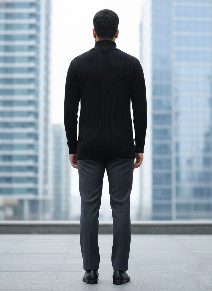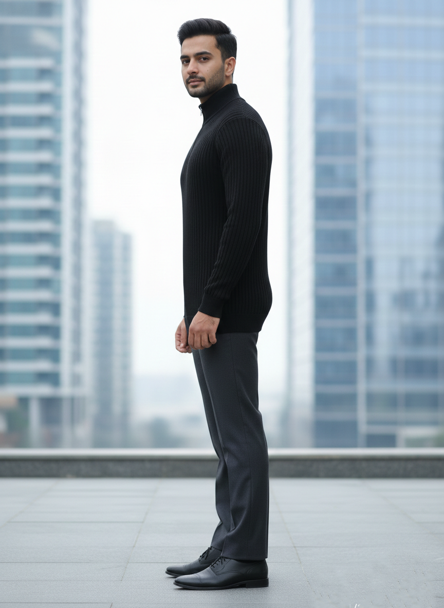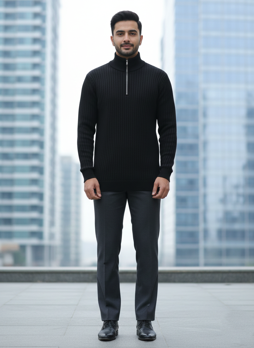 Elevate your seasonal wardrobe with this sleek black quarter-zip ribbed sweater. Crafted with a vertical textured knit, it offers a structured yet flexible fit that effortlessly contours the silhouette. The high-neck collar and polished silver-tone zipper add a modern, refined touch, making it the perfect layering piece for the office or a night out. Pair it with tailored charcoal trousers for a “quiet luxury” aesthetic that commands attention without saying a word.