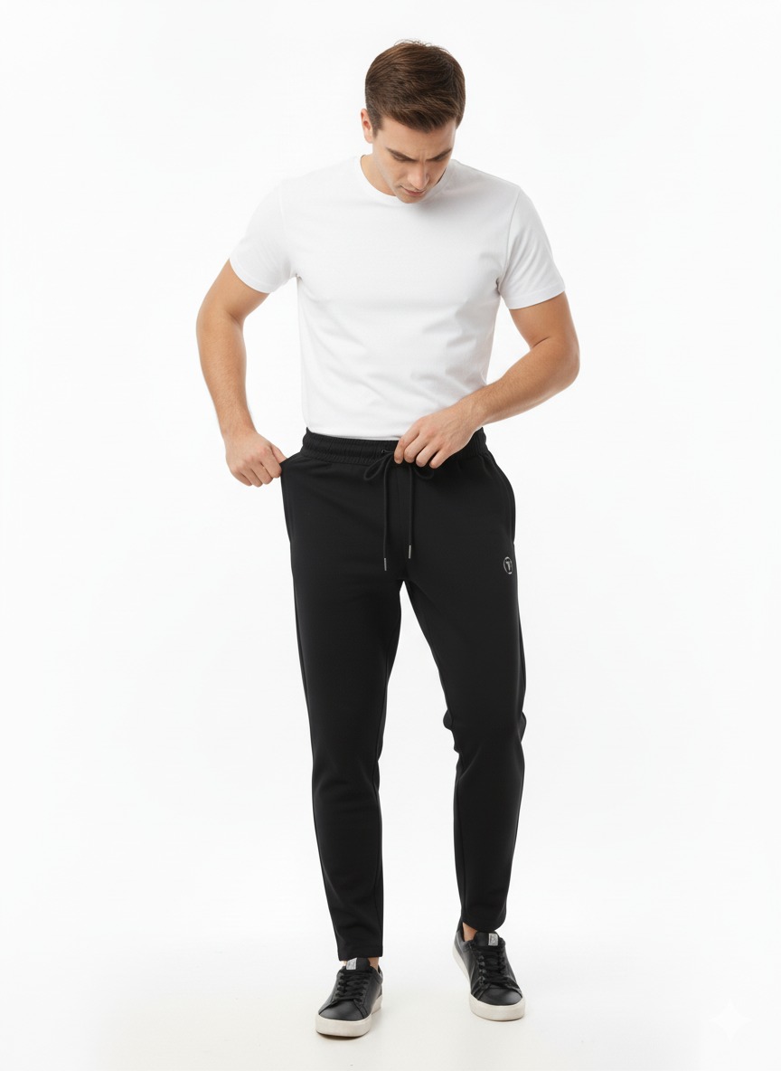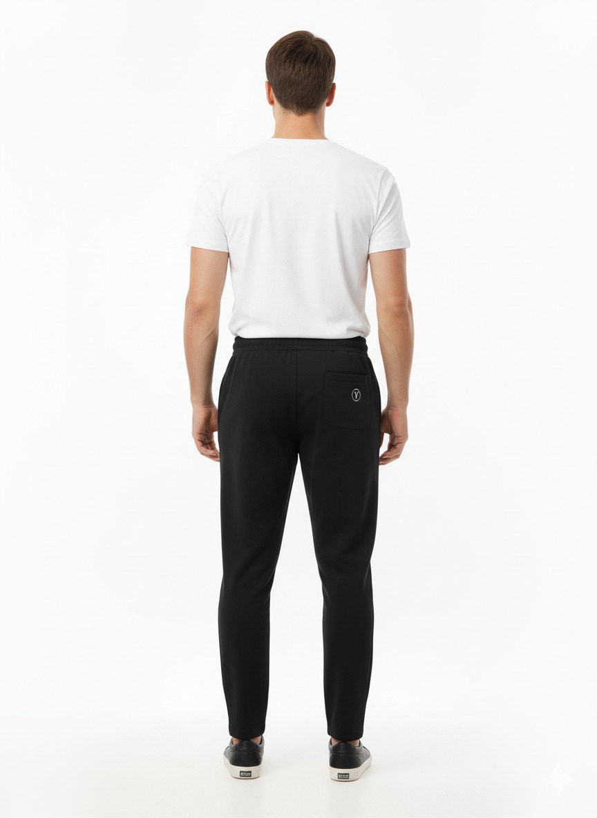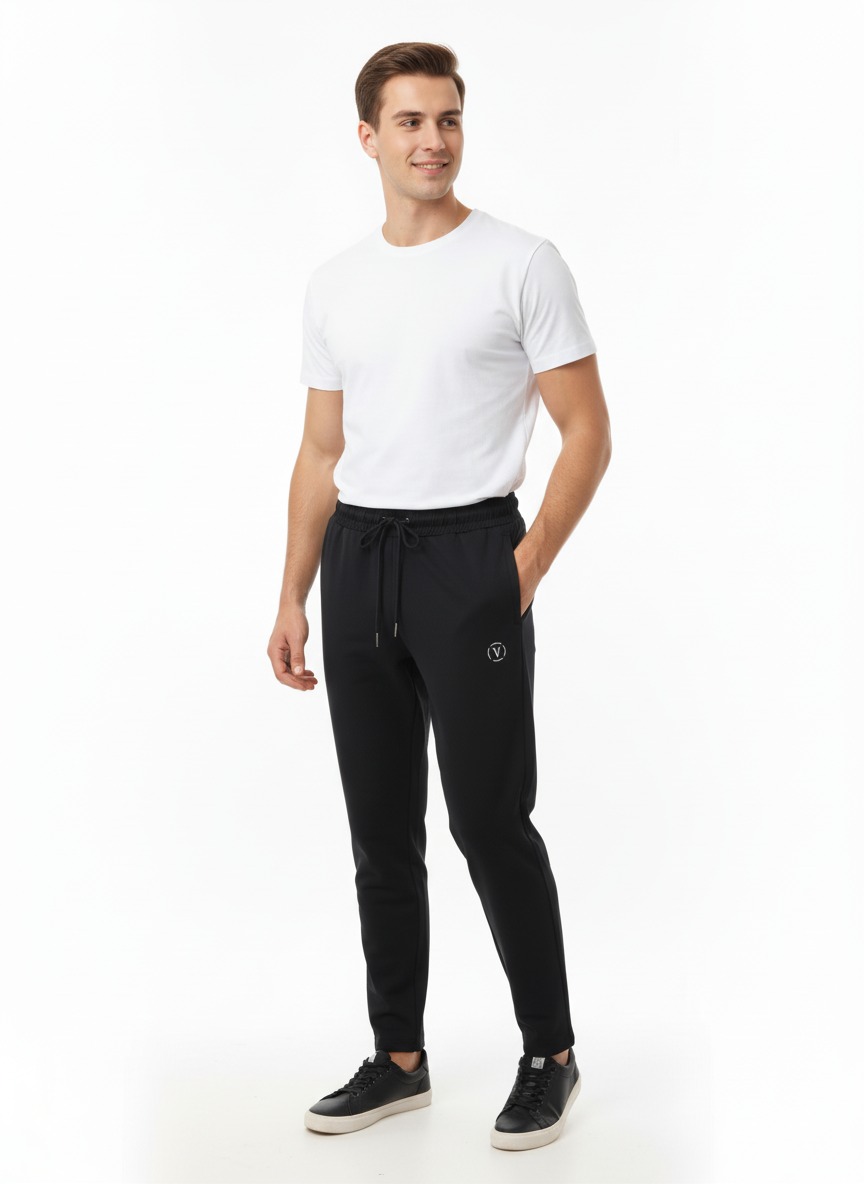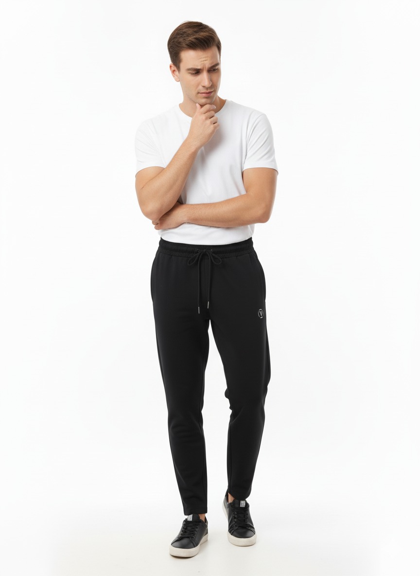 these sleek black joggers. Featuring a comfortable drawstring waist, a tapered fit for a modern silhouette, and a subtle brand logo, these pants are perfect for workouts, lounging, or running errands in style. Their versatile solid black color makes them easy to pair with any top or sneakers.