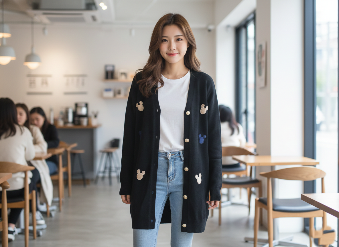 This chic, black button-down cardigan combines classic comfort with a touch of playful charm. Featuring a timeless V-neckline and elegant gold-tone buttons, it is elevated by a scattered pattern of whimsical Mickey Mouse silhouettes in soft cream and navy blue.