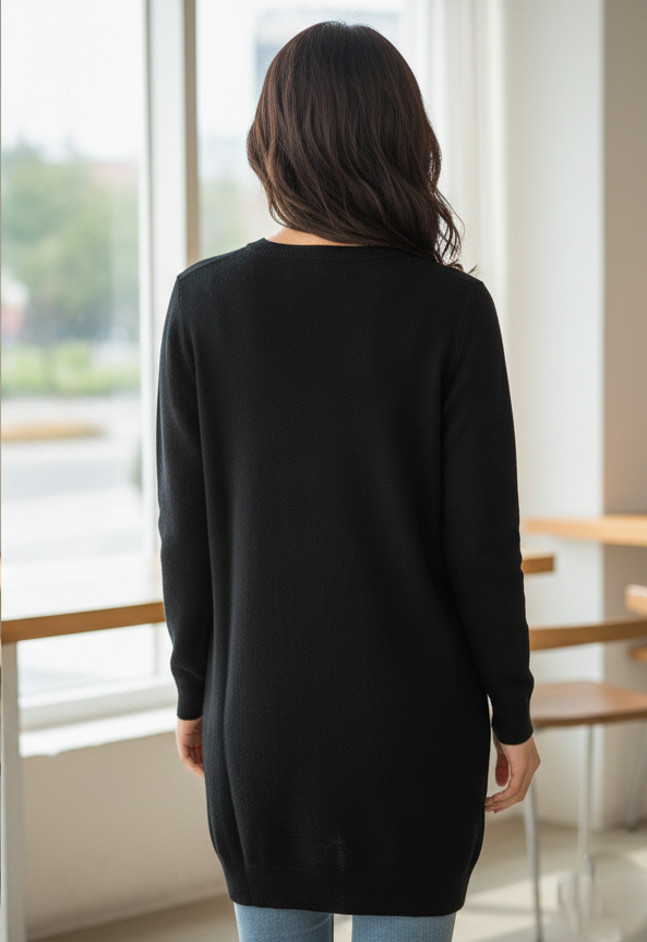 Design: Sophisticated black knit with a relaxed, versatile fit.