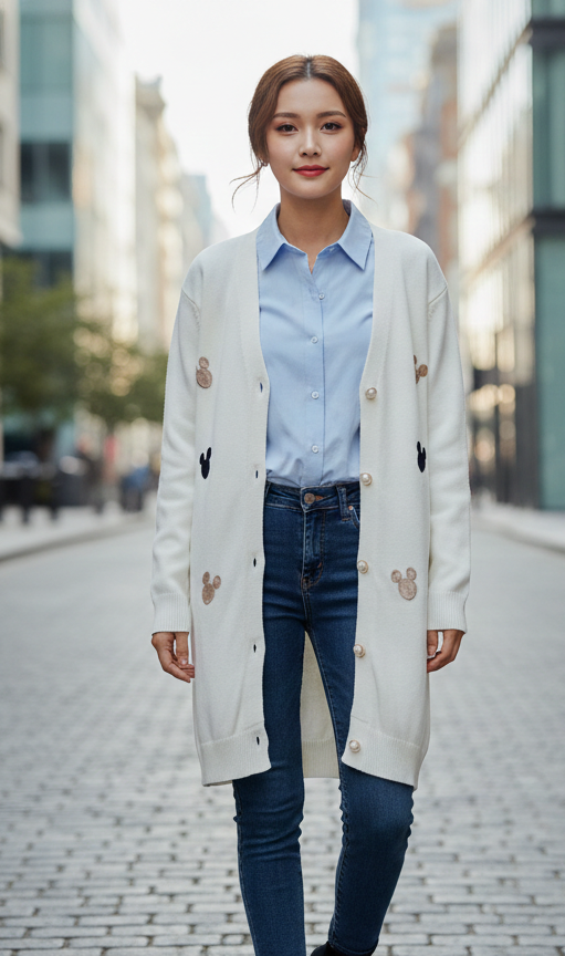 This chic, White button-down cardigan combines classic comfort with a touch of playful charm. Featuring a timeless V-neckline and elegant gold-tone buttons, it is elevated by a scattered pattern of whimsical Mickey Mouse silhouettes in soft cream and navy blue.