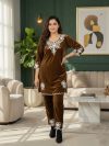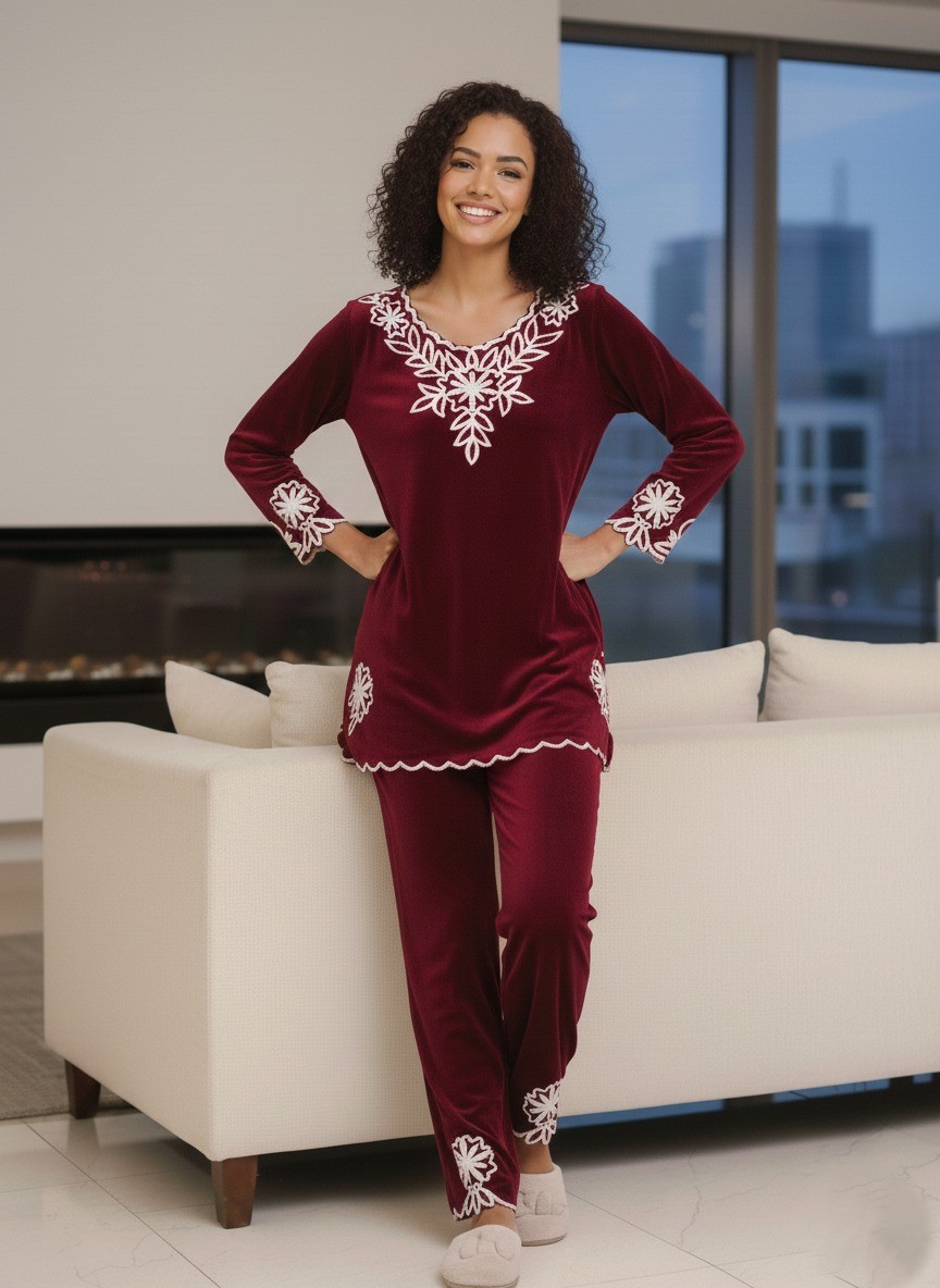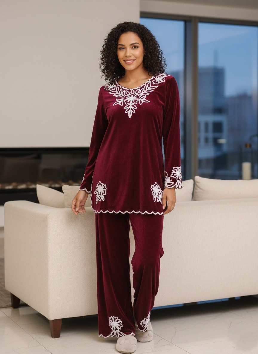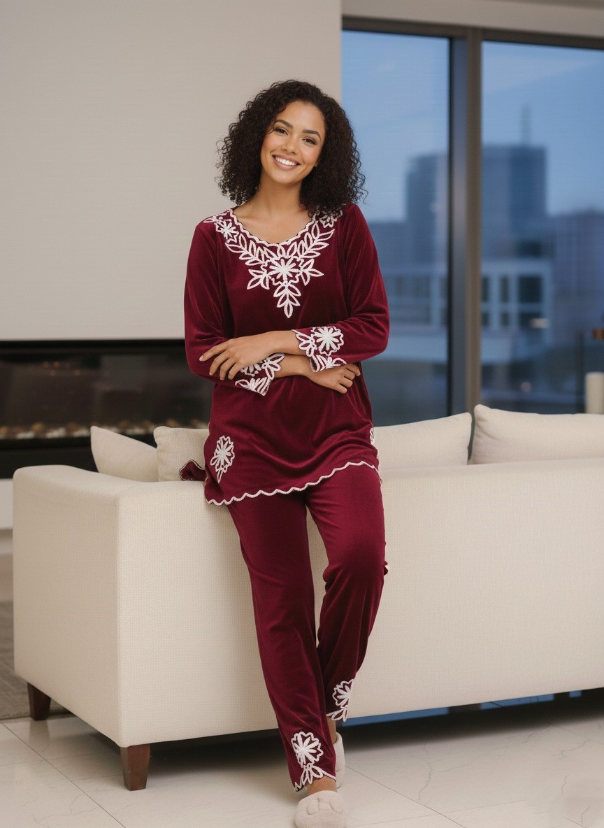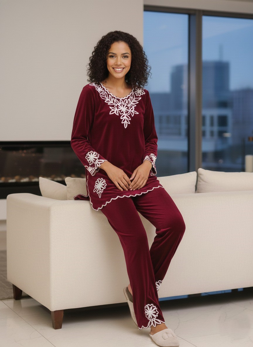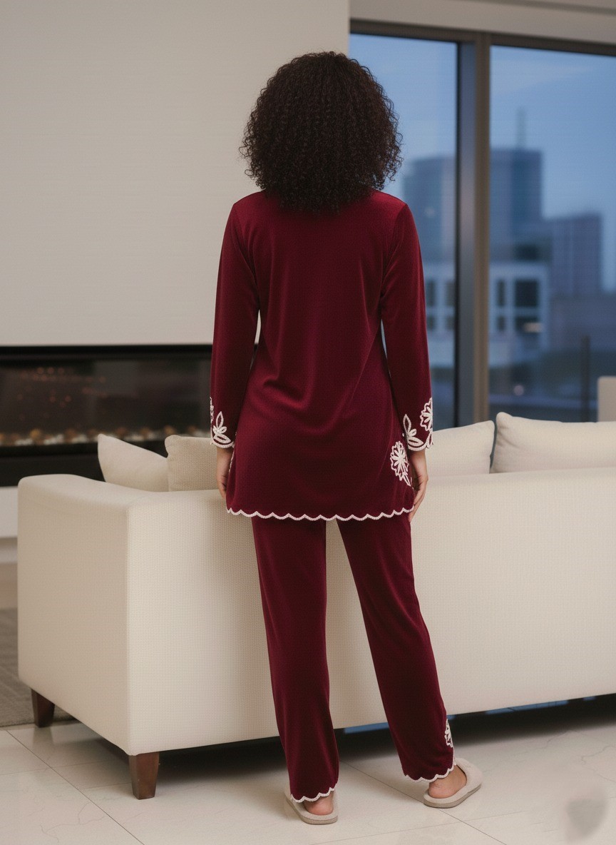 A women’s Dark Pink velvet co-ord set, which includes a long-sleeve tunic-style top and matching pants. It is primarily designed as loungewear or a casual suit set suitable for winter. Both the top and the bottom feature intricate white embroidery in a floral or ethnic motif pattern, particularly around the neckline, cuffs, and hem of the kurta. The set is made from a rich, soft, plush velvet fabric, valued for its warmth and sophisticated sheen. The trim often features delicate white lace work along the edges