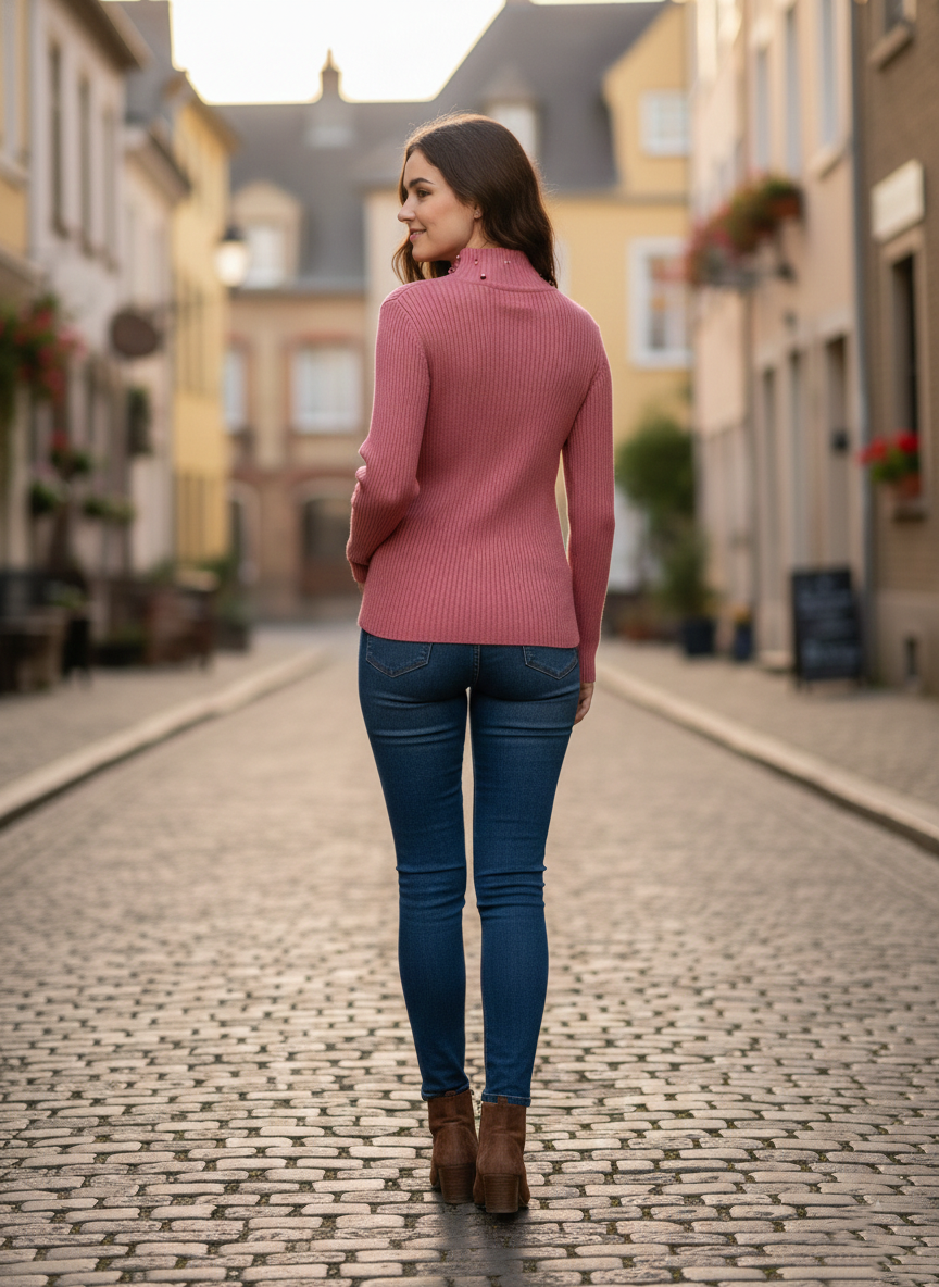 Elevate your winter wardrobe with this stunning dusty rose ribbed knit. Combining cozy comfort with sophisticated flair, it features a chic high neckline adorned with delicate pearl embellishments that add a touch of effortless glam.