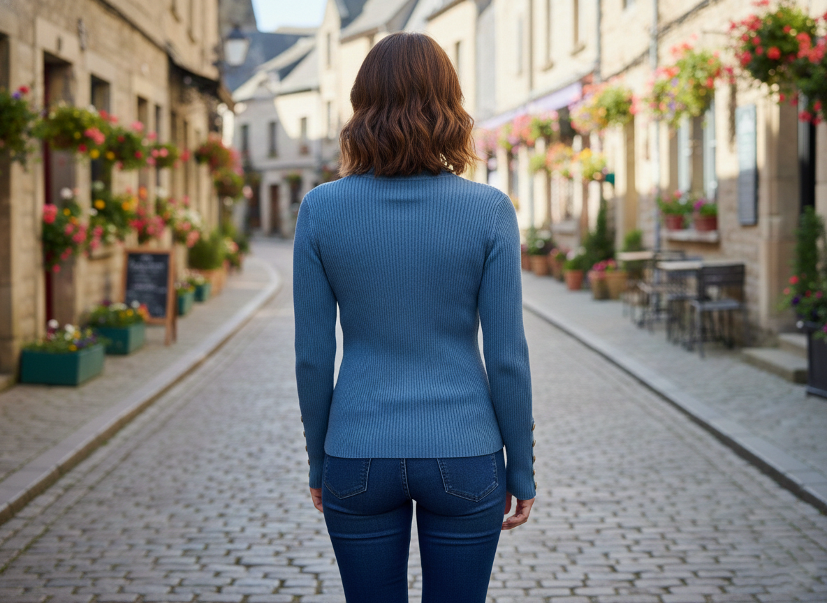 Elevate your everyday essentials with this chic, form-fitting knit. Crafted with a classic ribbed texture and a sleek high neck, this sweater stands out with its luxe gold button detailing along the cuffs.