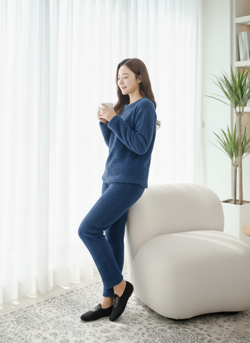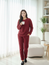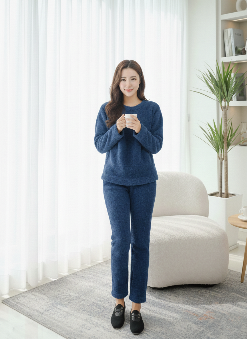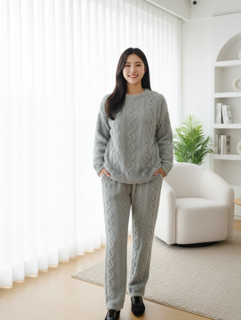 The outfit shown is a women’s grey fuzzy fleece loungewear or pajama set featuring a distinctive cable-knit texture. This two-piece set is specifically designed for comfort and warmth during the winter months, comprising a long-sleeved, crew neck top and matching full-length pajama pants. It is made from a soft, plush material often referred to as sherpa fleece or faux fur, providing a very cozy feel. The style is a coordinated set, frequently marketed as comfortable nightwear or loungewear by various retailers online. The tag on the top indicates a size of “M”.