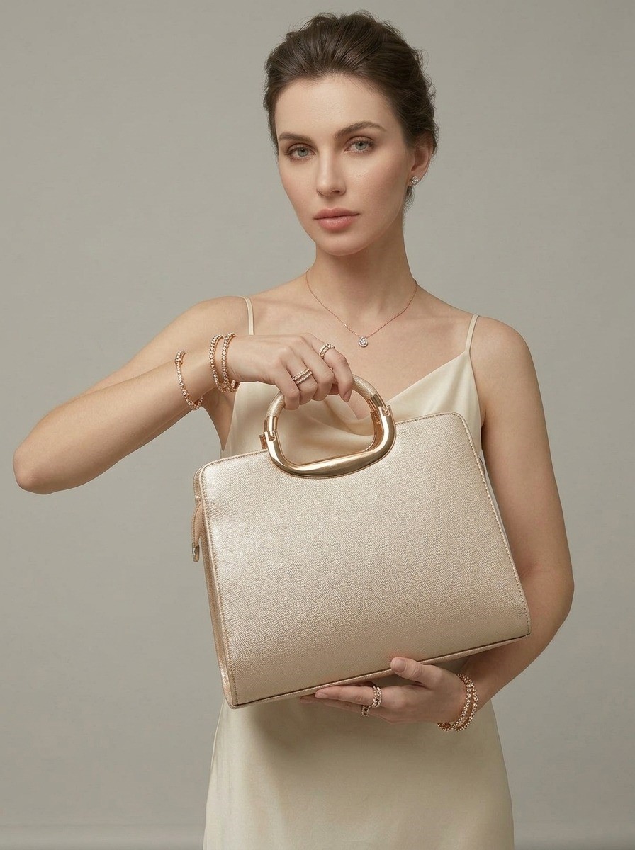 Elevate your style with this elegant and sophisticated handbag, designed for those who love timeless fashion. Crafted in a luxurious champagne-gold finish, this bag features a sleek, structured silhouette that adds a premium touch to any outfit.