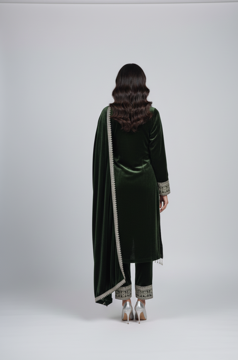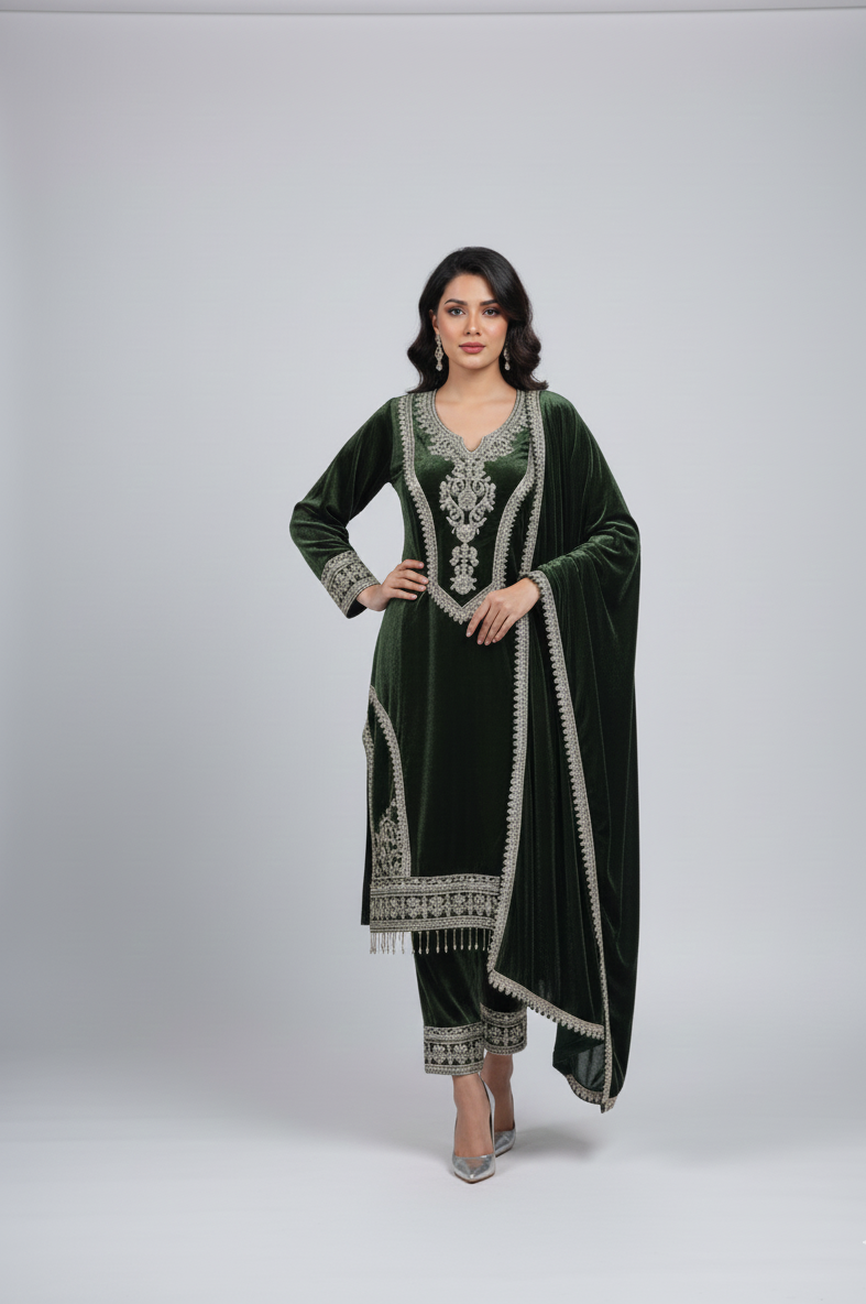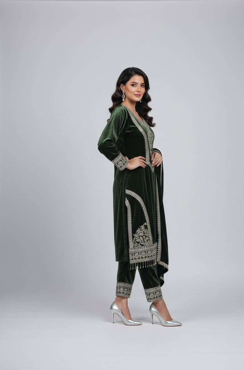 a women’s Dark Green velvet co-ord suit set with extensive, elaborate embroidery. This style of outfit, often referred to as an ethnic wear pant suit or kurta set, is popular for its rich look and warmth. The set is crafted from a soft, plush velvet fabric (likely viscose velvet), which provides warmth and a luxurious sheen.