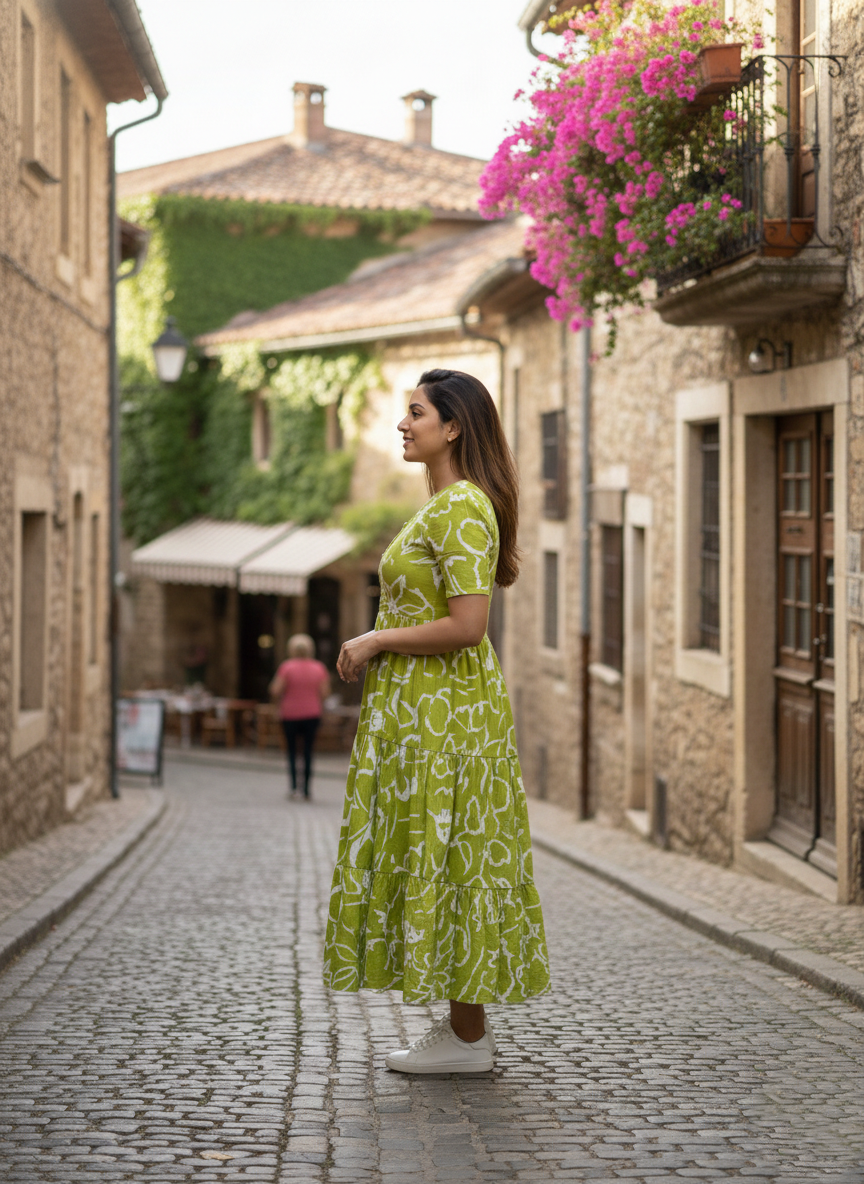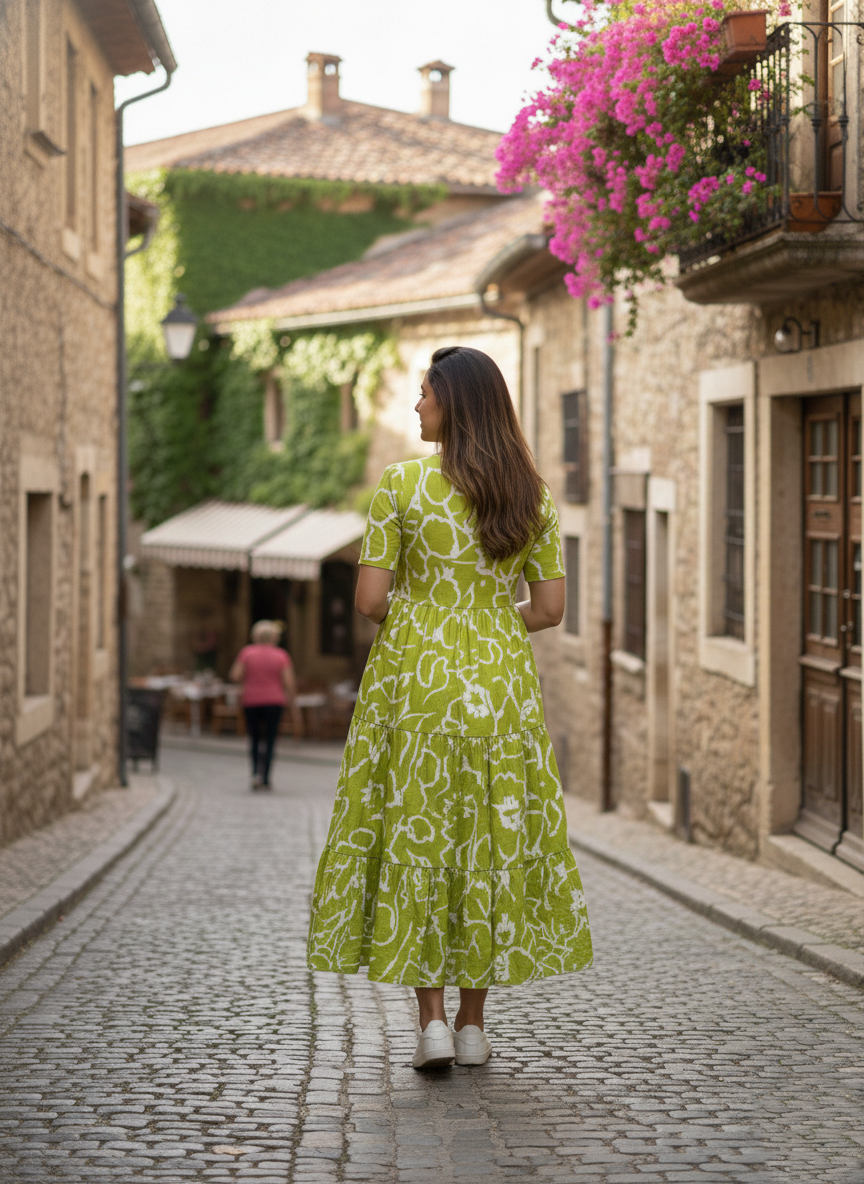 The fresh green colour with subtle white print gives a bright, elegant and youthful look, ideal for daytime styling. One-piece, easy slip-on dress