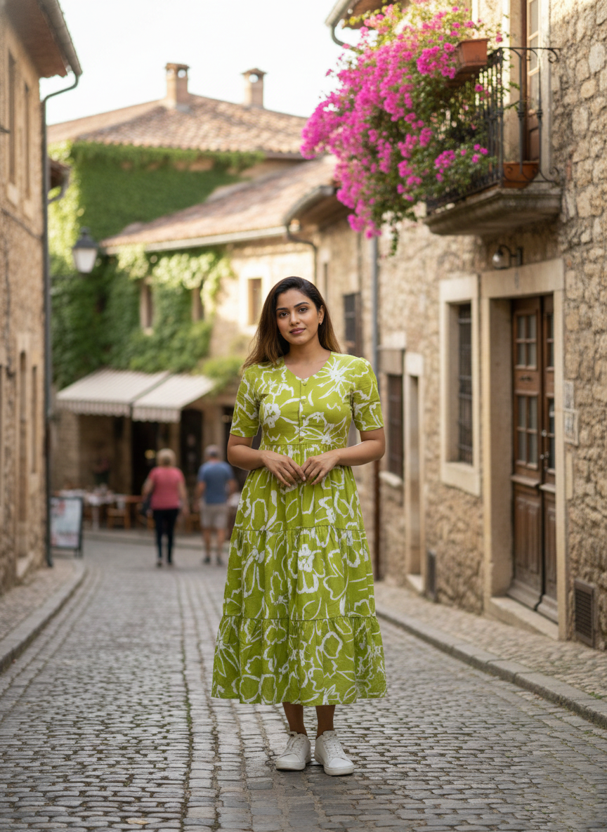 Refresh your summer wardrobe with this beautiful Pure Cotton green printed one-piece dress. Designed in a soft, breathable fabric, this dress features a round neckline, short sleeves and a flattering high-waist gathered silhouette. The tiered, flowy skirt adds graceful movement, making it perfect for everyday wear as well as casual outings.