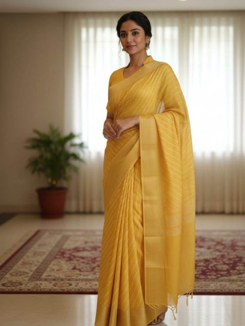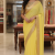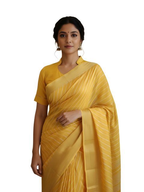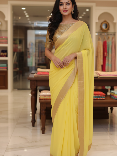 Featuring a soft, flowing drape with a sleek golden border, it pairs perfectly with a shimmering golden blouse for that effortlessly elegant look.