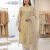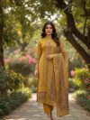 a lemon yellow straight kurta with a delicate floral print and white embroidery on the neckline, paired with off-white straight trousers with a subtle gold border. It is completed with a lightweight dupatta featuring a matching, large-scale floral print and a pale green border. pure cotton