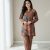 This is a cozy, coordinated two-piece set featuring a tunic-style top and matching trousers. The fabric has a rich, earthy brown and maroon base, heavily patterned with an intricate geometric print. The long-sleeved tunic is further embellished with a prominent floral and leaf design in complementary shades of orange, green, and gold, running down the front panel and sides. It has a mandarin collar and a partial button placket, suggesting comfortable casual wear or loungewear. The overall aesthetic is traditional and warm.
