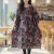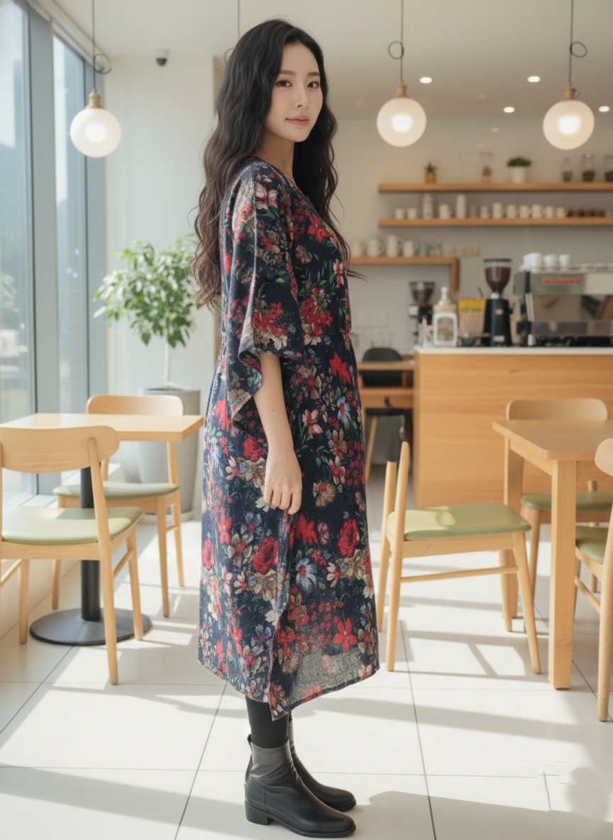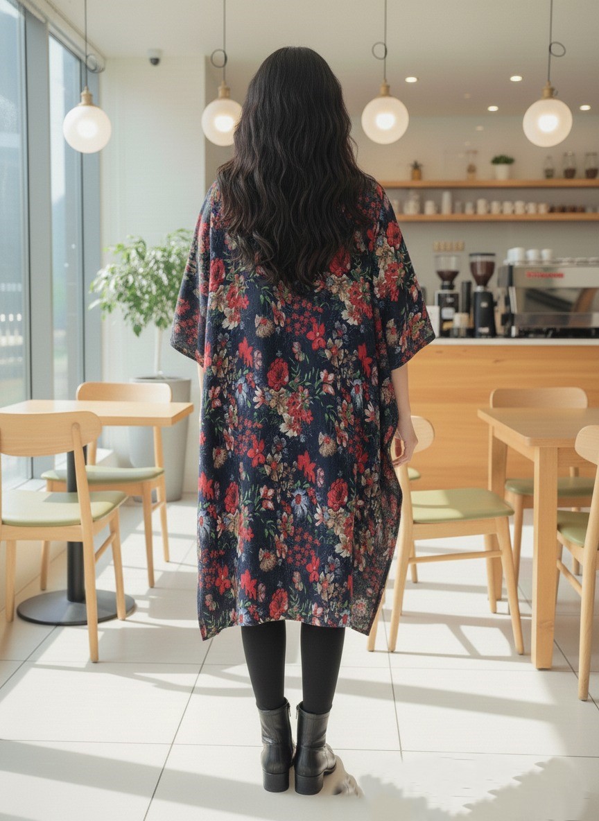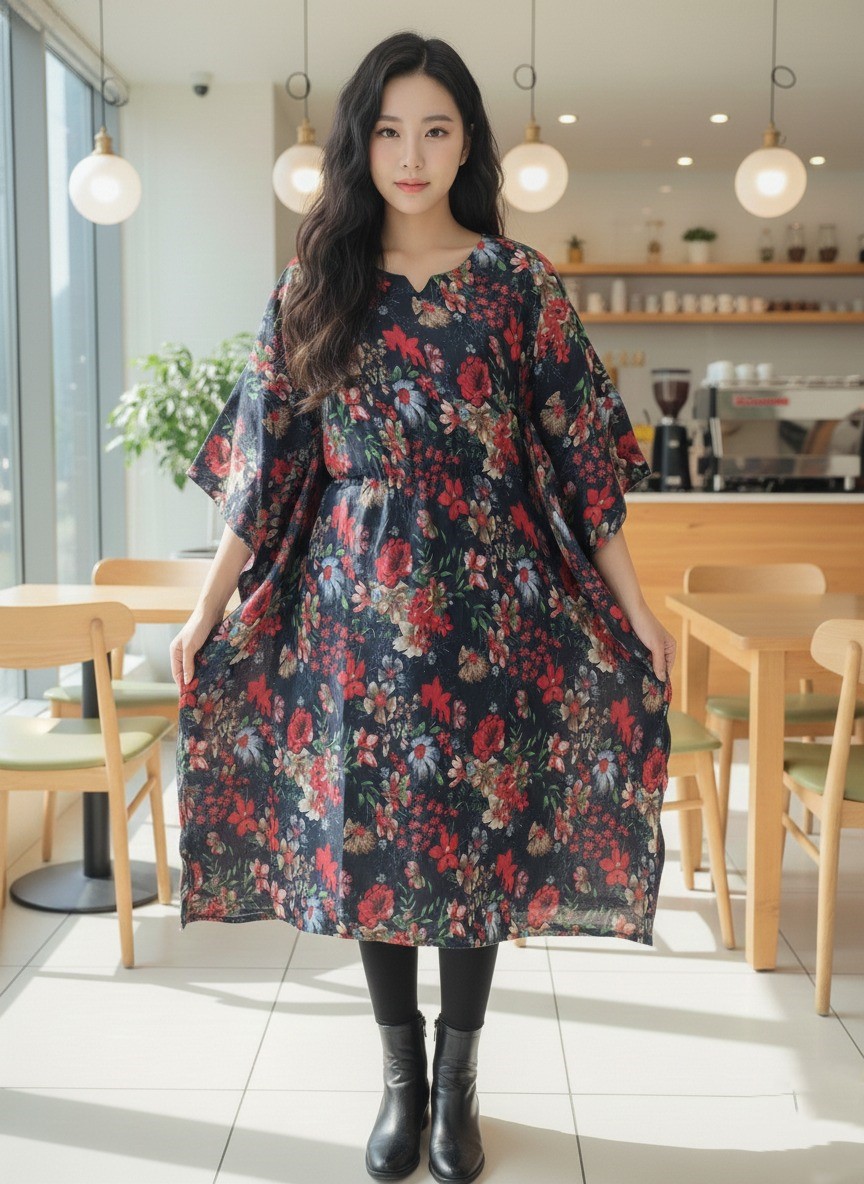 This stylish kaftan-inspired midi dress features a vibrant, all-over floral print in rich tones of red, blue, and cream against a deep navy background. Designed for both comfort and elegance, it boasts a relaxed silhouette with wide, flowing sleeves and a subtle cinched waist for added shape.