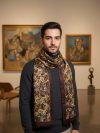 Experience the timeless artistry of Kashmir with this exquisite Ahujasons Signature Stole. A true masterpiece of textile heritage, this piece blends traditional craftsmanship with a modern, eclectic edge.Intricate Artistry: Features a stunning “Kalamkari-inspired” floral vine on a deep ebony base, seamlessly transitioning into classic Paisley (Buta) motifs.Contemporary Twist: Finished with a vibrant, multi-colored striped border that adds a playful, modern energy to the traditional design.Rich Palette: A sophisticated mix of jewel tones—ruby red, mustard gold, and turquoise—woven with precision to create a luminous finish.Premium Comfort: Crafted from high-quality wool/pashmina blend, offering a feather-light feel with exceptional warmth.Drape it over a solid black turtleneck for a high-contrast evening look, or pair it with a crisp white kurta to let the heritage patterns truly pop.