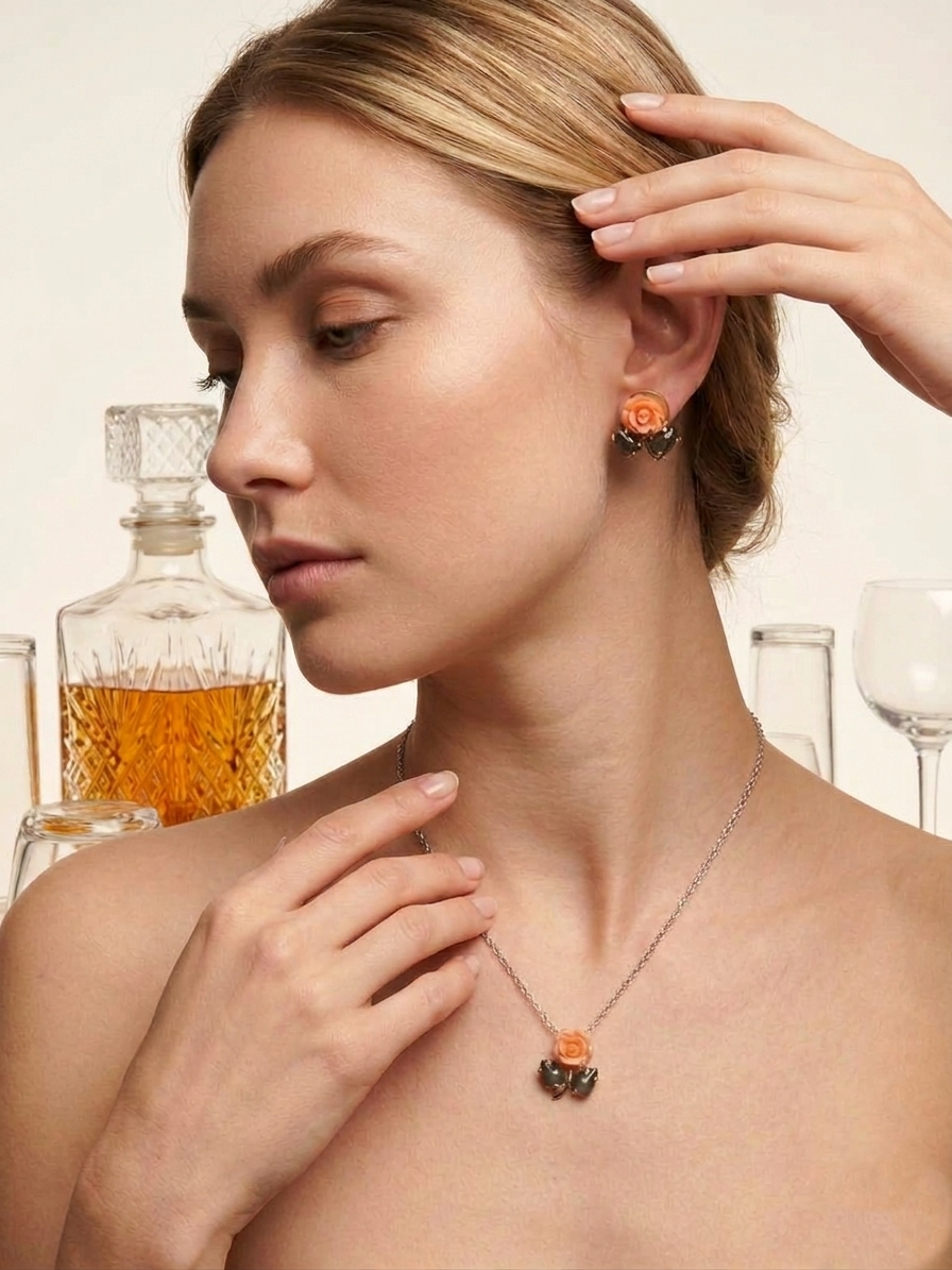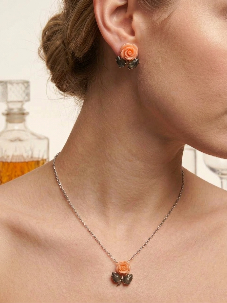 Delicate yet striking, this handcrafted necklace features intricate rose-shaped charms in a rich coral hue, accented with deep green crystal beads and golden details. The floral motif evokes timeless romance, while the refined chain adds modern grace. Perfect for evening soirees or adding a touch of charm to everyday wear, this piece effortlessly blends sophistication with nature-inspired beauty.