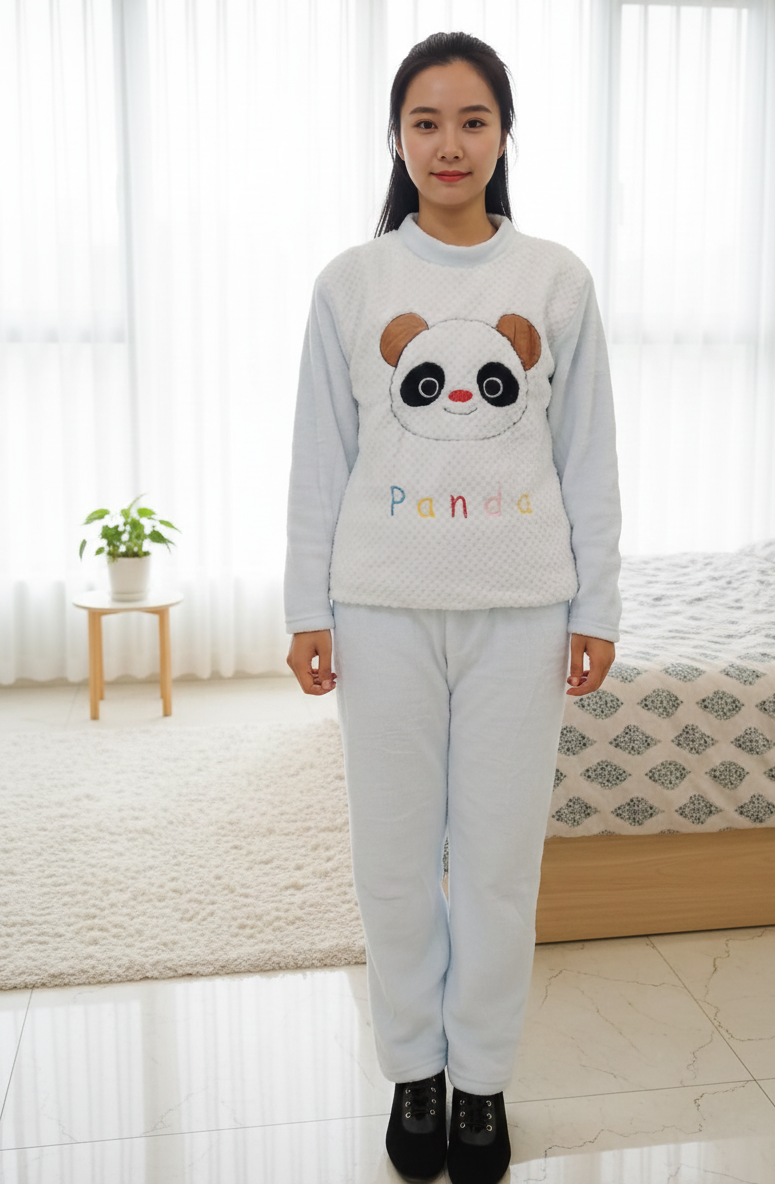 Print Fleece Winter Night Suit for Women-Light Blue and white