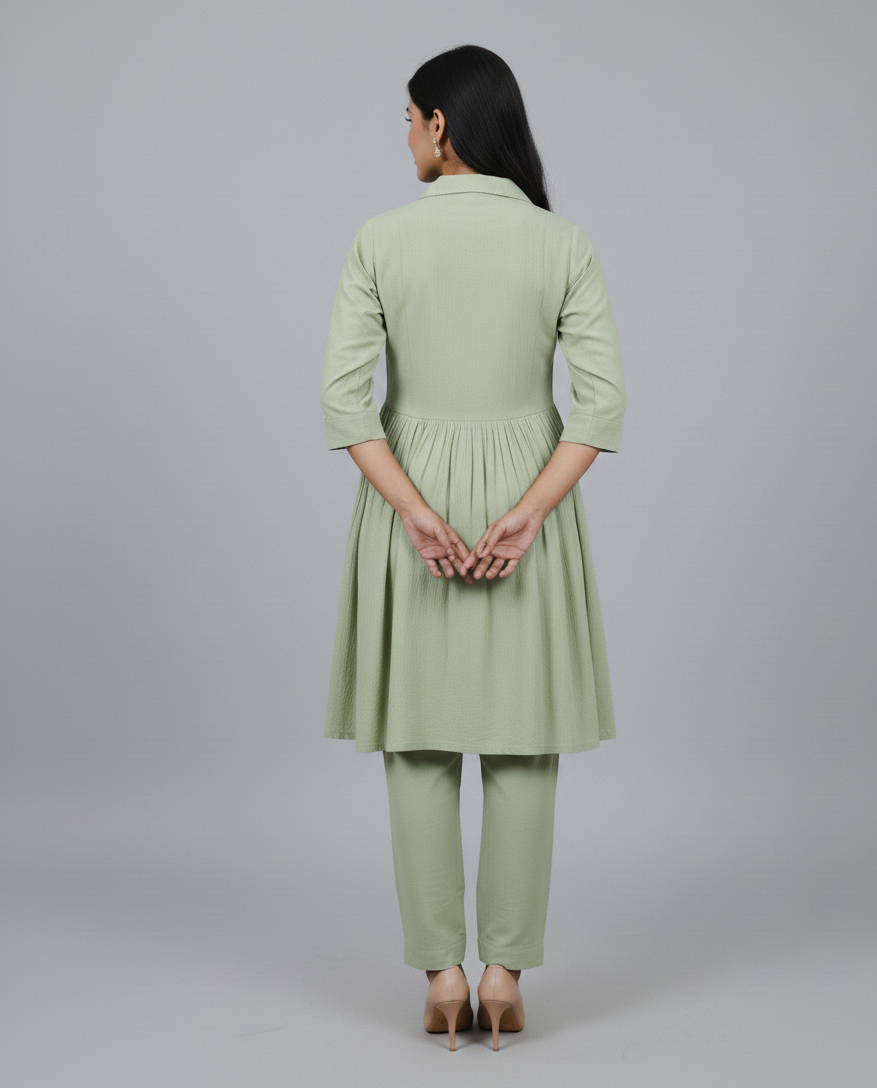 Fabric: The pure cotton construction ensures the outfit is breathable, skin-friendly, and ideal for warmer climates. The Top: It features a tunic-style flared shirt (often called an A-line or frock-style kurta). It has a classic notched lapel collar and a full-length button-down front. The waistline is slightly gathered to create a voluminous, breezy flare.