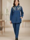 a women’s Purple denim or cotton-blend co-ord set The set is made of a purplefabric, likely denim, a denim blend, or cotton, which is common for such co-ord sets. A long-sleeved, collared button-down shirt with a tunic or relaxed fit. It features intricate gold, beige, or white floral-patterned embroidery across the chest and shoulders.