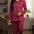 This is a cozy, two-piece women’s loungewear or night suit, featuring a rich magenta/deep pink color with a subtle textured or heathered fabric finish. The set includes a long-sleeved top that resembles a button-down shirt or jacket, adorned with four silver-tone buttons and a collar. The most prominent feature is the detailed embellishment on the front, consisting of two curved, wing-like or wave-like patterns made of sparkling rhinestones in shades of silver, pink, and orange/gold, adding a touch of glamour. The set is completed by matching trousers made from the same comfortable fabric, suggesting it is ideal for warmth and relaxation.