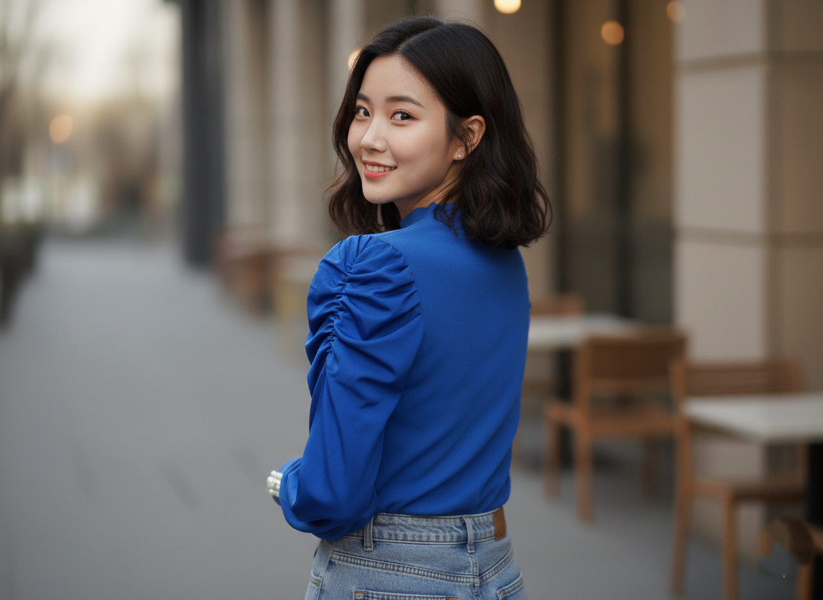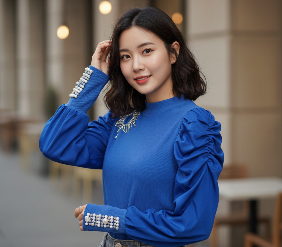 Statement Sleeves: Dramatic, ruched puff sleeves transition into sleek ribbed cuffs adorned with delicate pearl accents.