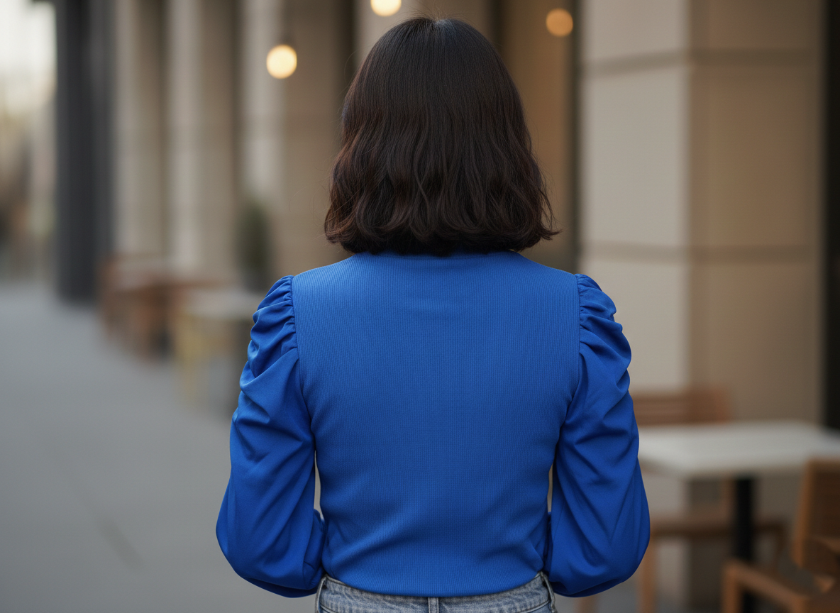 This vibrant royal blue top is a perfect blend of modern chic and sophisticated detail. Designed to stand out, it features a unique combination of textures and sparkling accents.
