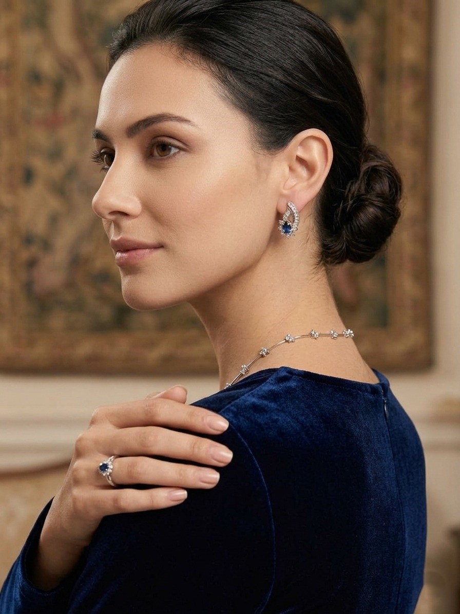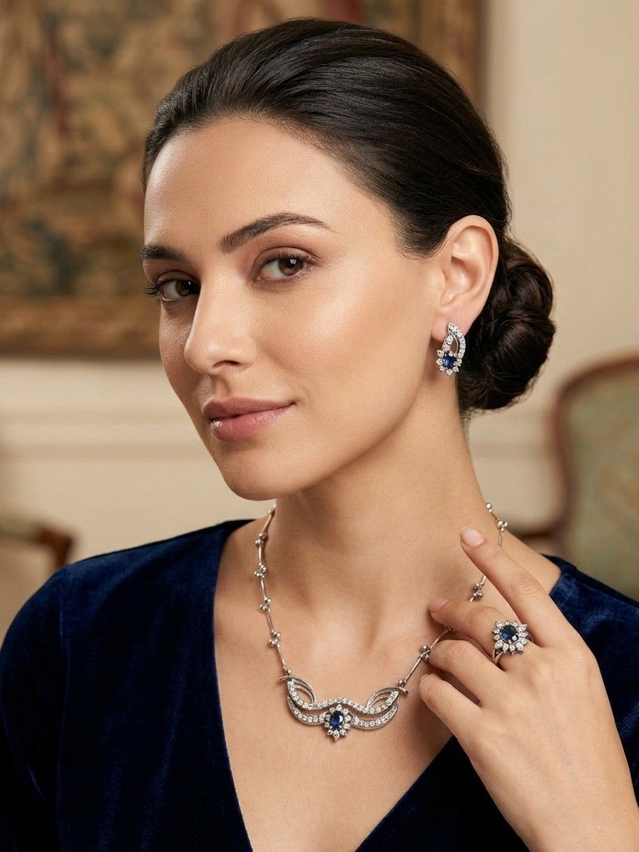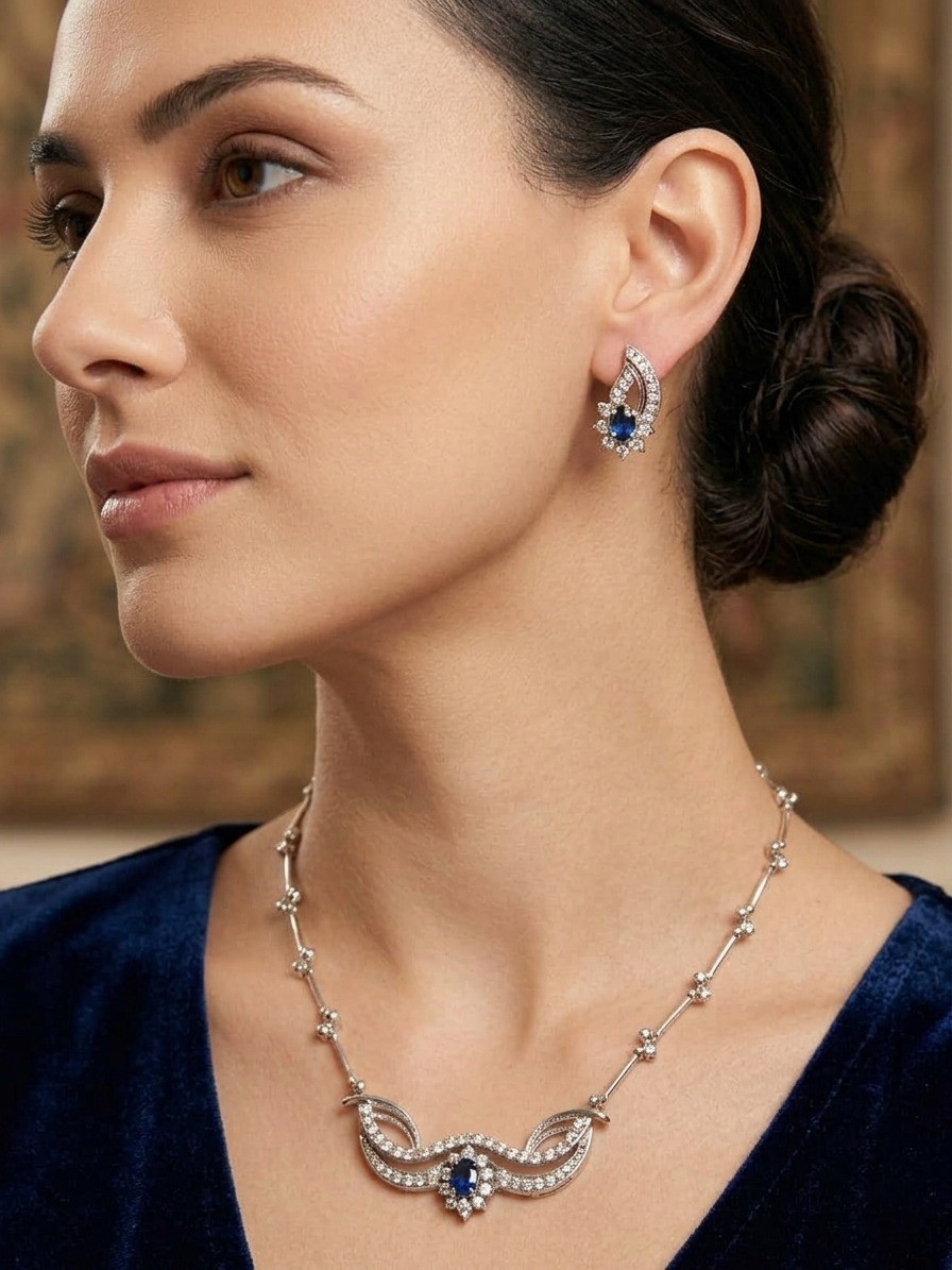 Add a touch of refined elegance to your ensemble with this stunning silver jewellery set. The necklace features a graceful, wave-like design adorned with shimmering white stones and a central deep-blue gemstone, creating a striking focal point. Complementing the necklace are matching earrings, each showcasing the same intricate craftsmanship and signature blue stone, perfect for both formal occasions and special evenings. The delicate metalwork and timeless style make this set a classic addition to any jewellery collection.