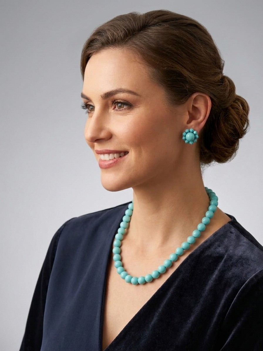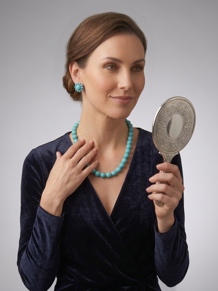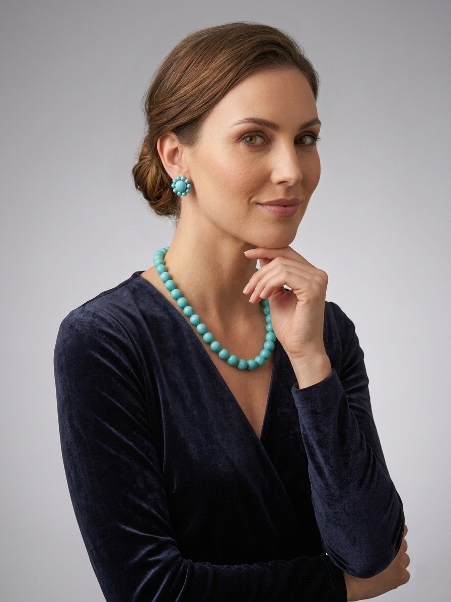 This stunning handcrafted Jewellery set features a matching turquoise bead necklace and earrings, delicately paired with an ornate gold-toned keepsake box that adds a regal touch.