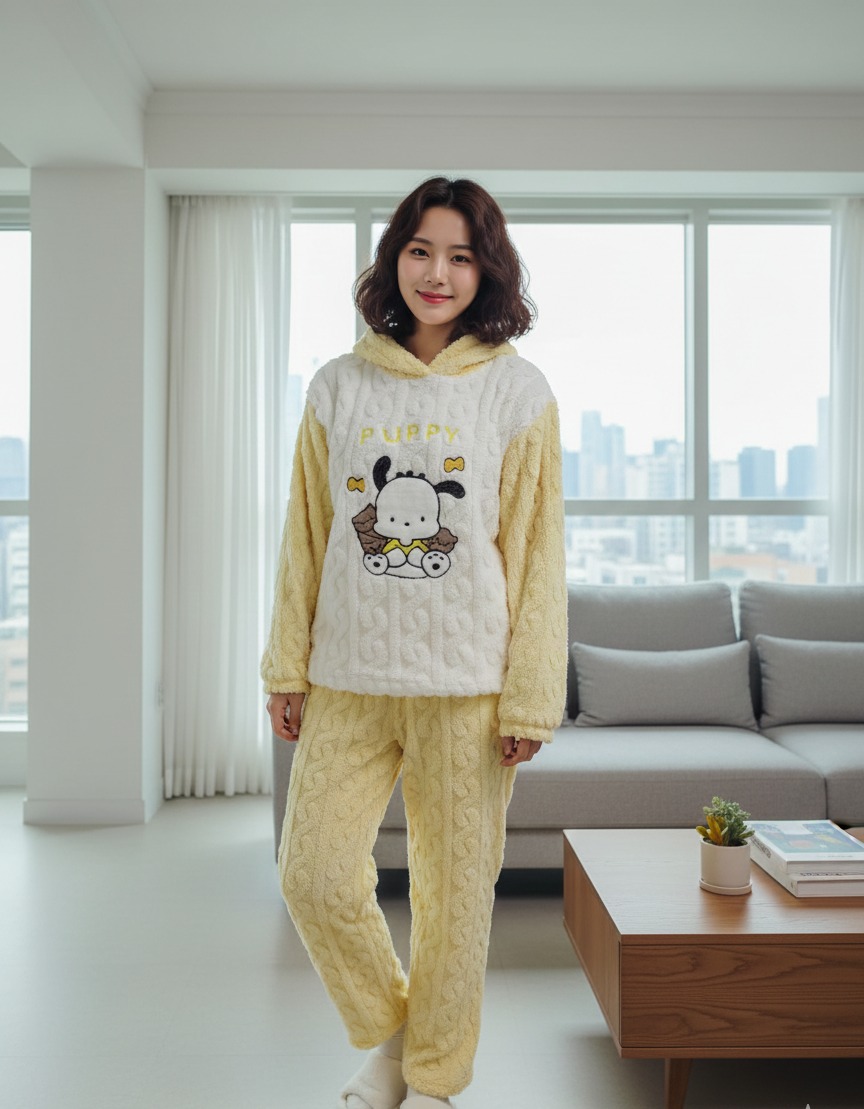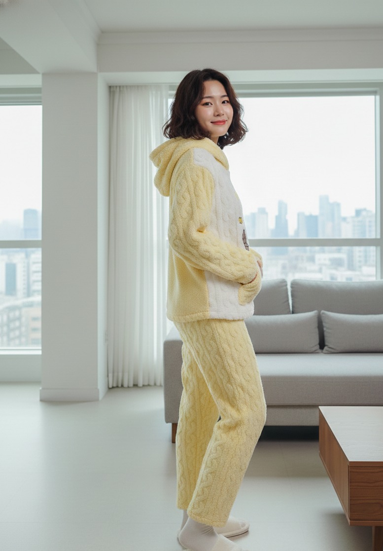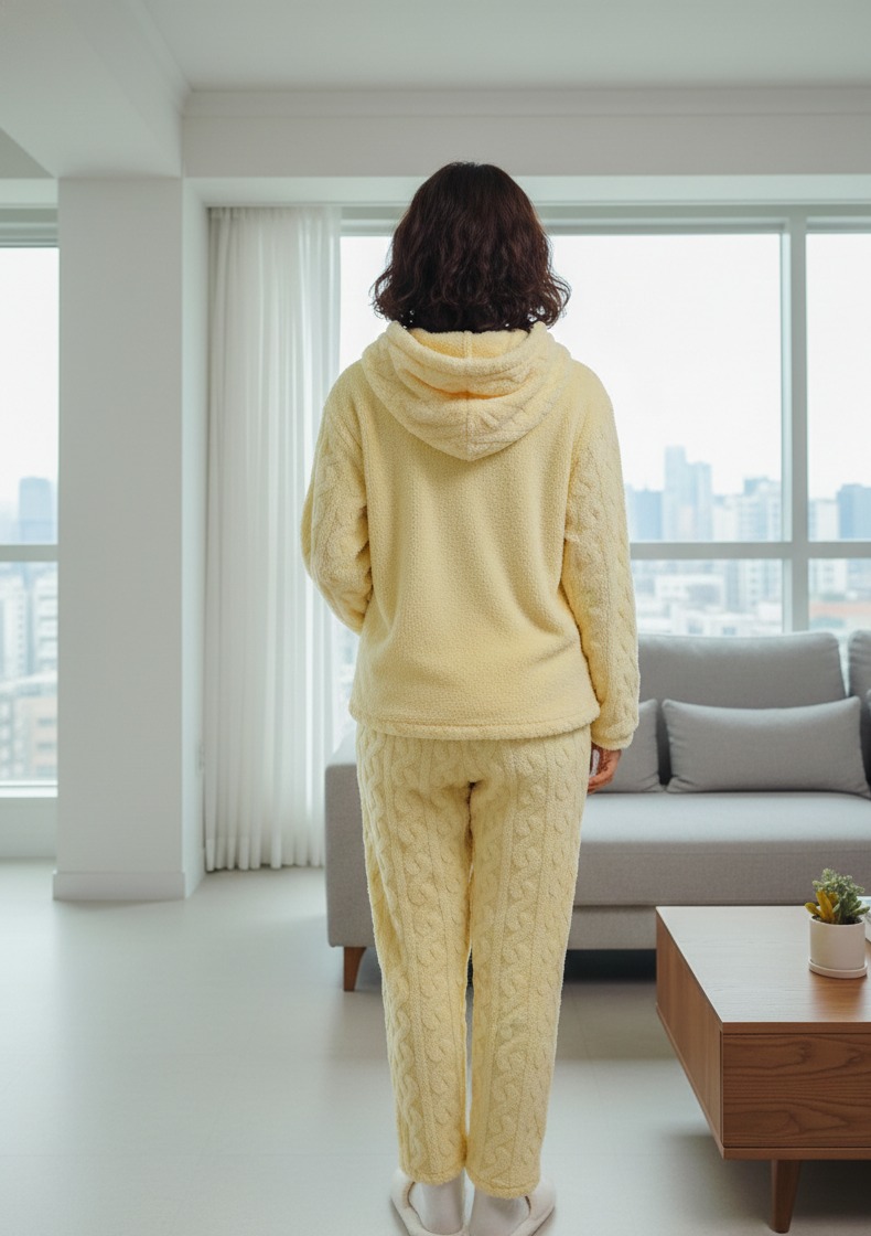 Embrace total relaxation with this ultra-plush, Yellow-and-cream loungewear set. Designed for those who prioritize both warmth and whimsical style, this outfit feels like a permanent hug.Supreme Texture: Crafted from a high-pile, sherpa-style fleece with a unique embossed cable-knit pattern that adds depth and a premium feel.